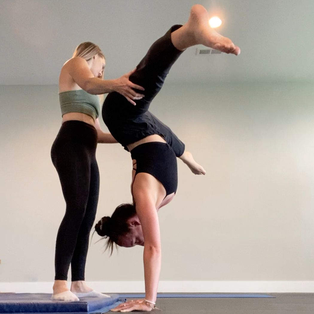 Amber coaching someone doing a handstand.